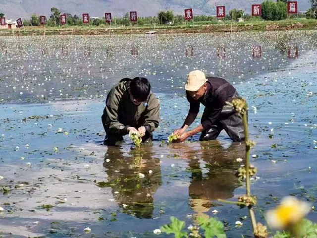 因此,在9年前,洱海治理團隊就“看上”了海菜花,他們用幾年的時間研究,將海菜花從湖里邊撈起來,像插水稻一樣種在農(nóng)田里,喜獲成功,經(jīng)過七八年努力,種植面積達到了幾千畝。但它的前提條件是——水必須是清澈的好水。