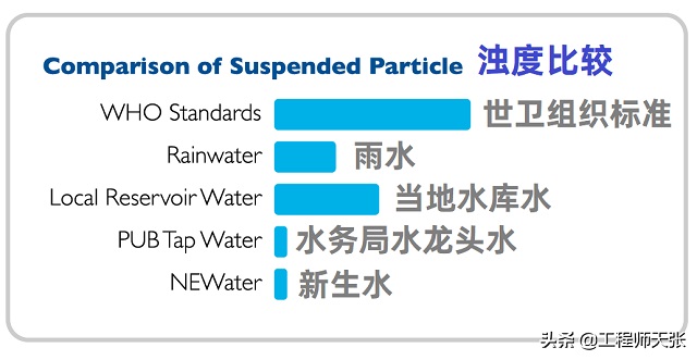此外,江河和水利樞紐水里帶有較多的是懸浮顆粒和膠體溶液顆粒物,這種顆粒物被地面上的降水沖洗到河水和水利樞紐中。而新生水因?yàn)榛钚蕴窟^(guò)濾,使產(chǎn)生水渾濁度的殘?jiān)w粒物成分大幅度降低,因此NEWater 比 PUB 水更為清亮。