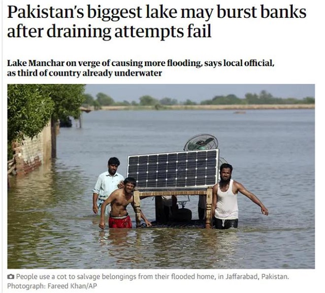 據(jù)《衛(wèi)報(bào)》9月5日?qǐng)?bào)道,巴基斯坦一名高級(jí)官員警告說,該國(guó)最大淡水湖曼查爾湖瀕臨決堤。此前,巴基斯坦當(dāng)局試圖以一種可控的方式排水,但以失敗告終。