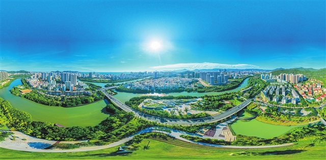 從空中俯瞰三亞,一幅“山水人城”美景現(xiàn)于眼前:河流穿城而過,水在城中,青山環(huán)繞……河中的魚群、棲息的白鷺、岸堤的游人,繪就和諧相融新畫卷。