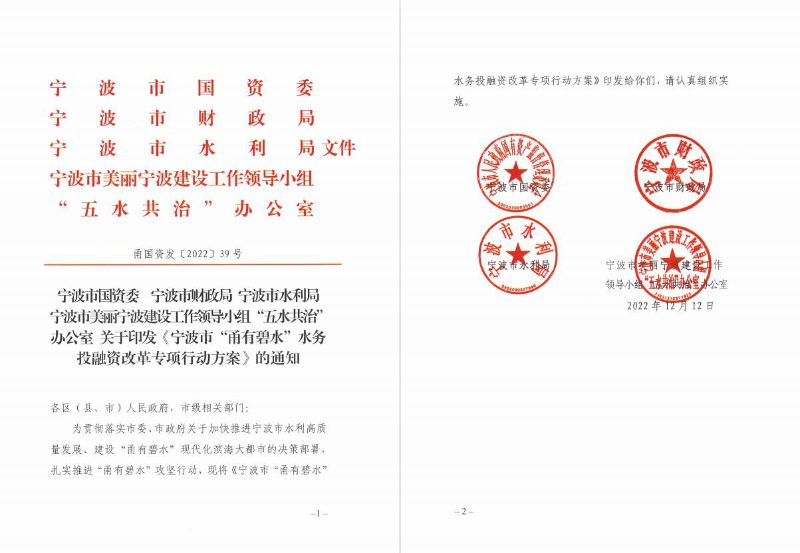 寧波市國資委等四部門聯合出臺水務投融資改革專項行動方案