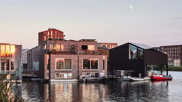 過去幾年,“漂浮住宅”的理念也逐漸興起。在阿姆斯特丹北部的斯孔奇普社區(qū),Space&Matter建筑公司設(shè)計(jì)了30座水上住宅。項(xiàng)目于2021年竣工,目前已吸引了100多位住戶。
