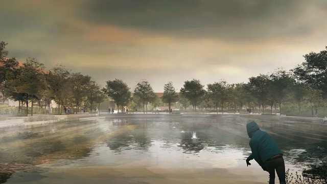 這座公園坐落在山腳下,它的改造基于增設(shè)蓄水空間的想法。混凝土曲棍球場(chǎng)被降低了3m,變成了蓄洪空間。當(dāng)球場(chǎng)蓄滿水后,雨水會(huì)流向下沉式的玫瑰花園,最終匯入湖中。公園中還計(jì)劃建造可調(diào)蓄雨洪的洼地。拉夫恩還提到,公園圍墻的建造能夠有效防止雨水外流,同時(shí)通過巧妙的設(shè)計(jì),也可避免場(chǎng)地中的古樹移植。