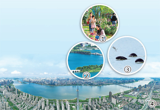 圖①:市民在濱江月季園游玩。馬悅 攝 圖②:象湖濕地公園。馬悅攝 圖③:在贛江水域嬉戲的江豚。余會(huì)功攝 圖④:穿南昌城而過的贛江。