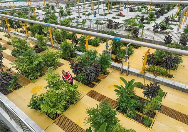 從空中俯瞰,散尾葵、芭蕉、鳶尾等47種植物共5300余株水生植物,有規律地分布在約3000平方米的食物鏈反應器頂部。鵝黃色的花朵、郁郁蔥蔥的綠葉,儼然一幅花園美景。但與天府新區第一再生水廠上的景觀公園不同的是,彩云湖污水處理廠的植物起到了更為重要的降解作用。