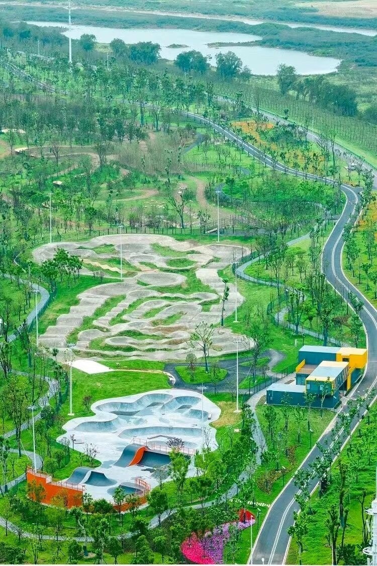針對場內原有的低洼區,項目團隊進行了創意“微雕”。許義文介紹,該區域原是一處9米深的大坑,受地表徑流和降雨影響,夏季易出現內澇。施工中,其將該處打造為下凹式綠地,坡面及坡底種植草本植物自然涵養水分,超標雨水經底部雨水收集口排入市政雨水管網。碎石賽道下10厘米處,敷設綠色植草格,滿足騎行需要同時,又兼顧雨水搜集調蓄的生態功能。成為占地1.6萬平方米,亞洲最大的XC自行車極限越野區。