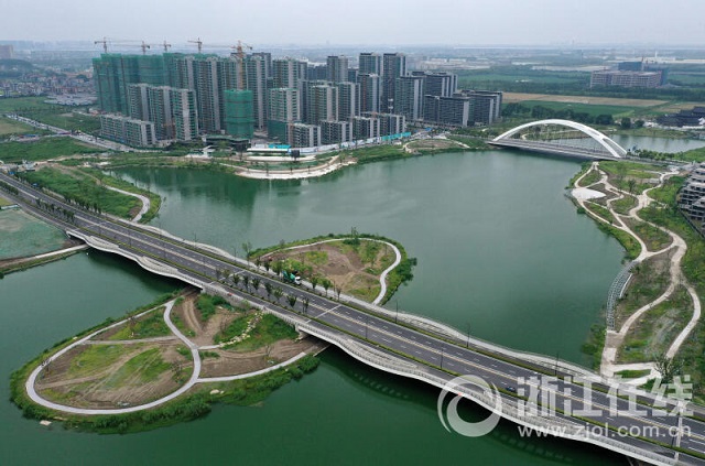 近年來,杭州進一步加大海綿城市建設力度。本組圖片為8月15日記者用無人機鳥瞰杭州錢塘區(qū)東湖防洪調蓄湖配套工程一期,其北岸的濱水空間“樣板段”已基本完工。該項目水域面積約34.5萬平方米,陸域面積約29.72萬平方米,涵蓋綠地面積約21.8萬平方米。公園以生態(tài)建設為核心,用多種植物打造水上森林、浩瀚蘆葦灘等特色景觀,延續(xù)生態(tài)野趣的濕地風貌,具備水質涵養(yǎng)及氣候調節(jié)等生態(tài)功能。