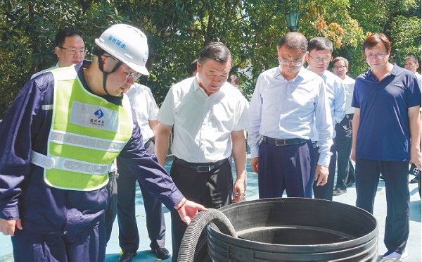 調研中,倪虹一行首先實地察看了福州市斗門調蓄池,詳細了解設施運行調度、標準化管理等情況。斗門調蓄池是福州市江北城區“六湖三園一池”蓄滯水體工程的重要組成部分。該項目在地上設置公交停車庫、地下設置了約16萬立方米的調蓄池,集約化利用場地空間,統籌解決公交停車和防澇問題。倪虹說,水是不可壓縮的,水的流動是有規律的,在城市排水防澇中,要順應自然、尊重規律。城市地下空間是地面空間的重要補充,利用地下空間調蓄雨水是經過實踐檢驗行之有效的辦法,這方面潛力很大,可以因地制宜推廣應用。