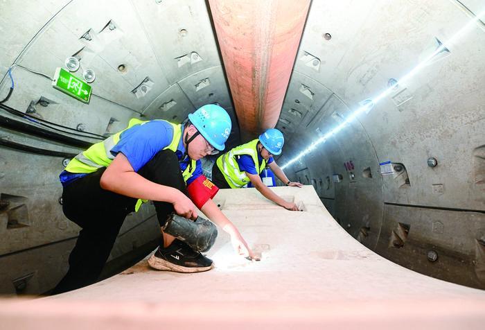 近日,天津市濱海新區(qū)雨污分流改造工程項(xiàng)目雨水主管隧道順利貫通,為項(xiàng)目完工打下堅(jiān)實(shí)基礎(chǔ)。據(jù)介紹,項(xiàng)目建成后,區(qū)域內(nèi)雨水和污水將“各行其道”,有利于提升市政道路排水能力,暢通城市排水管網(wǎng),緩解汛期城市內(nèi)澇問題。圖為工作人員在雨水主管隧道內(nèi)檢查盾構(gòu)管片。