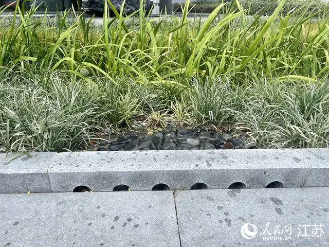 一處雨水花園內,圍住花園的路緣石上,開了6個圓孔。看似普通的設計,卻可以使雨水快速導入花園中,這是讓“海綿”吸飽水的第一步。