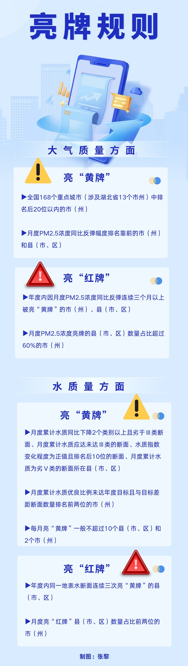 具體而言,大氣質(zhì)量方面,對全國168個重點城市(涉及湖北省13個市州)中排名后20位以內(nèi)的市(州)亮“黃牌”;年度內(nèi)因月度PM2.5濃度同比反彈連續(xù)3個月以上被亮“黃牌”的市(州)、縣(市、區(qū)),將亮“紅牌”。