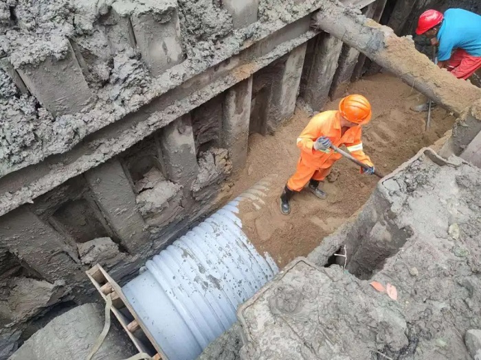 把原來這里的600~800的管子改成1000~1400管徑的管子接入后面的萬榮路口一個窨井以后,直接接入到江場北的雨水泵站,使我們的下閘道這一段的積水,得到明顯的改善。惠及到整個市北高新園區、大寧地區,對這兩個南北片區通行能力有一個很大的提高。