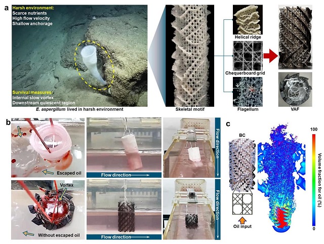 深海玻璃海綿(又稱“維納斯花籃”)是一種在1000m水下固著生長存活上萬年的生物,在適應惡劣環境的自然選擇過程中演化出獨特的結構,對復雜流態和貧營養環境具有良好的適應性。受這一現象啟發,尤世界教授團隊創新提出了一種仿玻璃海綿渦流錨固過濾器(VAF)并利用3D打印技術進行重構,解析了內棋盤網格+外脊螺旋復合結構對外部湍流能量削減轉化形成內部小尺度渦流的多物理場場協同機制,賦予了VAF卓越的流體動力學穩定性、高效的界面傳質特性和更長的內部停留時間,實現了亞臨界至超臨界流態范圍內穩定捕集浮油、乳化油和溶解油,捕集率高于97%。該研究體現了環境工程、流體力學、生物物理學和仿生學的深度交叉融合,為解決復雜水動力環境下的油類污染原位捕集和水環境修復提供了全新的思路和方法。