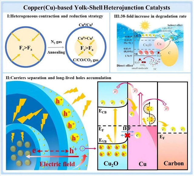 針對這一難題,昆明理工大學副教授周華晶、教授何亮等人攜手,創新地將多尺度結構工程與異質界面工程相結合,提出“結構-電場”協同調控策略,成功制備出具有“蛋黃-雙殼”構型的銅基復合微球。該材料通過構建多級電子傳輸通道與梯度電場,促使光電子向內核定向遷移,同時將氧化性空穴錨定在表面活性位點。結合銅納米顆粒的等離子體共振增強效應,實現了光能吸收與電荷分離效率的同步提升。實驗顯示,該材料對四環素類抗生素的太陽能驅動降解效率達到傳統材料的數十倍,處理后的水體滿足生態安全要求。
