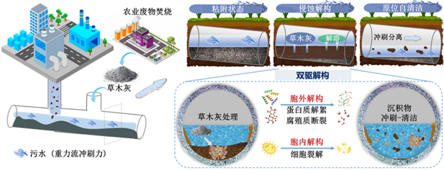 草木灰驅(qū)動(dòng)污水管道沉積物原位自清潔應(yīng)用場(chǎng)景示意圖