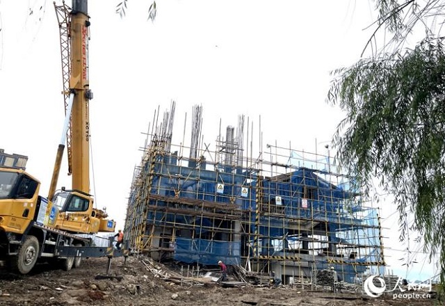 細(xì)雨綿綿,工地上一派忙碌景象。人民網(wǎng)記者 陳藍(lán)燕攝