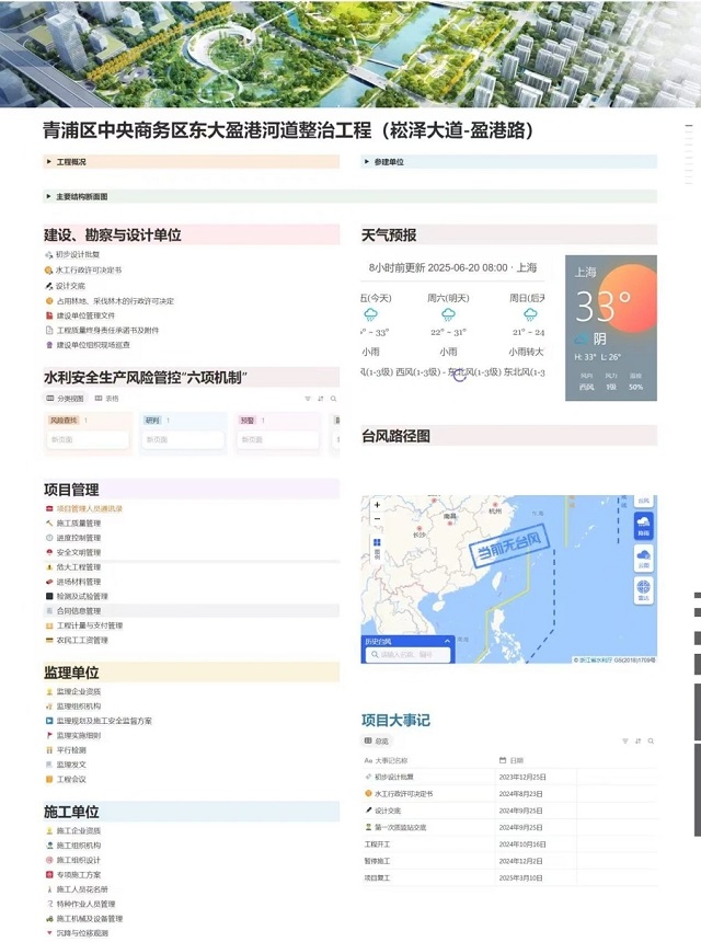 在基坑與閘室結構施工中,項目團隊以“科技興安”理念推動安全生產標準化建設,通過3D建模對施工全流程進行全景模擬推演,提前預判風險點。自主研發的“項目全流程監管系統”基于Notion平臺構建,集成質量、安全、進度等核心數據實時監控功能,創新嵌入臺風預警、精準天氣預報及AI大模型風險分析模塊,實現從隱患排查到應急處置的全鏈條數字化管控。