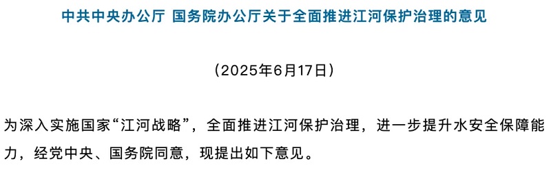 首次明確將流域綜合治理 提升至國家戰(zhàn)略高度 2025年6月17日,《中共中央辦公廳國務院辦公廳關于全面推進江河保護治理的意見》(以下簡稱《意見》)正式發(fā)布。