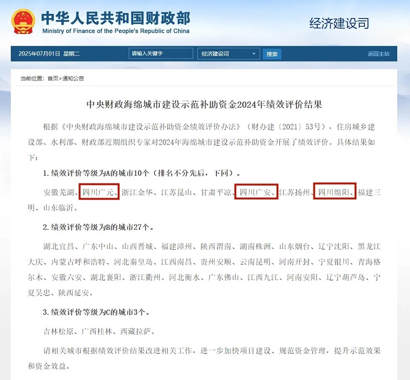 根據《中央財政海綿城市建設示范補助資金績效評價辦法》,住房城鄉建設部、水利部、財政部近期組織專家對2024年海綿城市建設示范補助資金開展了績效評價。評價結果顯示,共有10個城市績效評價等級為A,其中包括廣元市、廣安市、綿陽市等3個四川城市。