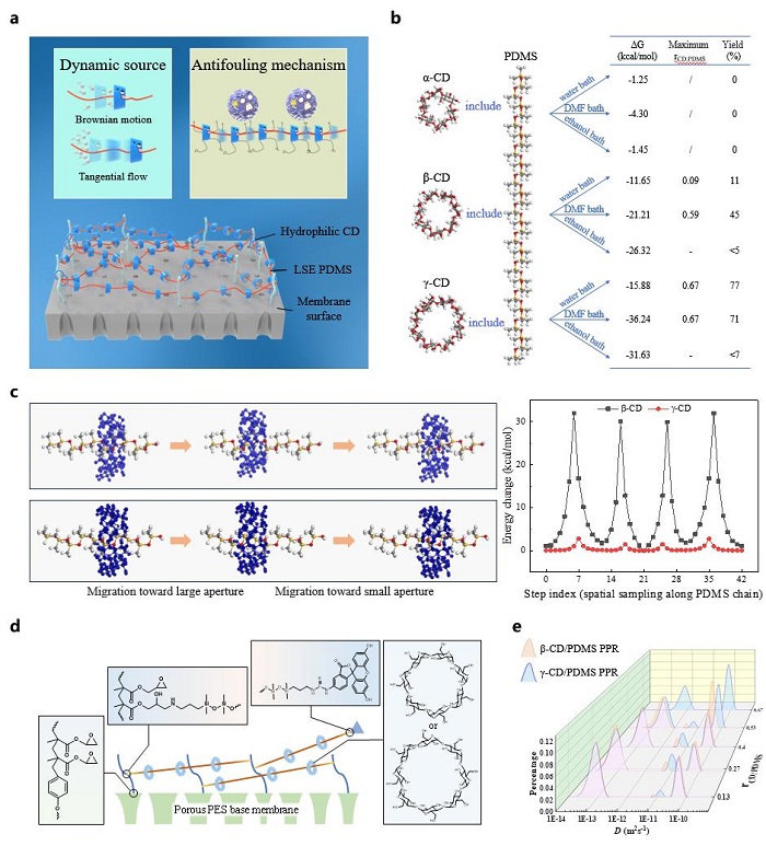 針對上述問題,團(tuán)隊提出使用超分子而非高分子在水處理膜表面構(gòu)建抗污染層的策略。超分子為由聚二甲基硅氧烷(PDMS)和環(huán)糊精(CD)組成的聚輪烷。PDMS為低表面能線性大分子,CD是親水環(huán)狀小分子,CD-PDMS聚輪烷呈線穿環(huán)結(jié)構(gòu)。CD可沿PDMS鏈滑動、旋轉(zhuǎn)和振動,形成相對動態(tài)親水-低表面能非均相微區(qū)。這一結(jié)構(gòu)可使污染物與膜表面的接觸不穩(wěn)定,輔以CD的布朗運(yùn)動,能夠在低切向流,甚至靜態(tài)條件下有效驅(qū)除膜表面污染物。此外,還可防止低表面能組分團(tuán)聚,并通過氫鍵作用攜帶并促進(jìn)水分子傳輸。
