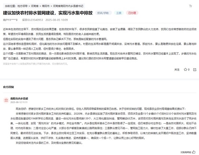 內(nèi)鄉(xiāng)縣農(nóng)業(yè)農(nóng)村局在回復(fù)中坦言,鄉(xiāng)鎮(zhèn)污水處理廠雖已建成,但管網(wǎng)配套仍是短板。“我們正積極爭取項(xiàng)目,以有力的舉措扎實(shí)開展好戶廁改造工作,堅(jiān)持?jǐn)?shù)量服從質(zhì)量、進(jìn)度服從實(shí)效,求好不求快,扎實(shí)穩(wěn)步推進(jìn),堅(jiān)持質(zhì)量第一,確保改一個(gè)成一個(gè),讓群眾用上放心好用的廁所?!?br />