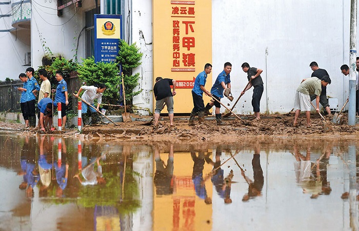 在廣西百色市凌云縣下甲鎮,人們在清理道路上的淤泥(2023年8月24日攝)陸波岸攝/本刊