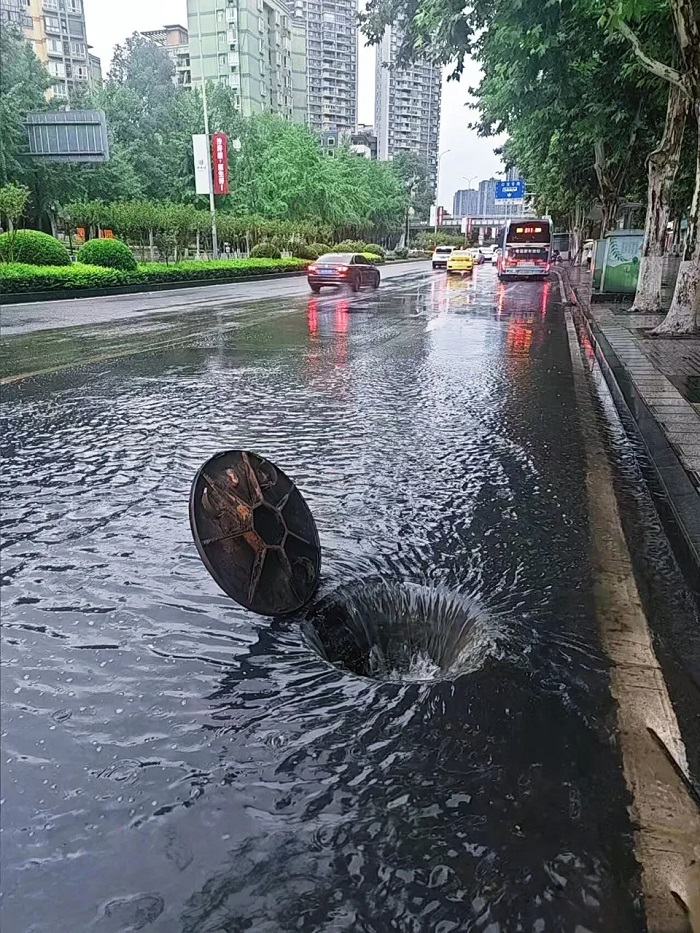 重慶沙坪壩區住建部門提前將下水道井口打開,以確保泄水通暢。沙坪壩區氣象局供圖