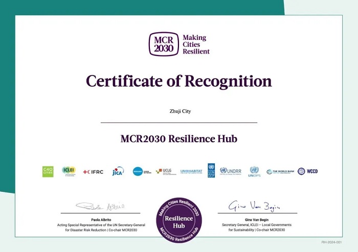2024年,聯合國減災署公布“世界韌性示范城市”名單,浙江省諸暨市成為繼韓國仁川、菲律賓馬尼拉、韓國蔚山之后,亞太地區第4個獲此稱號的城市,也是全國首個“世界韌性示范城市”。
