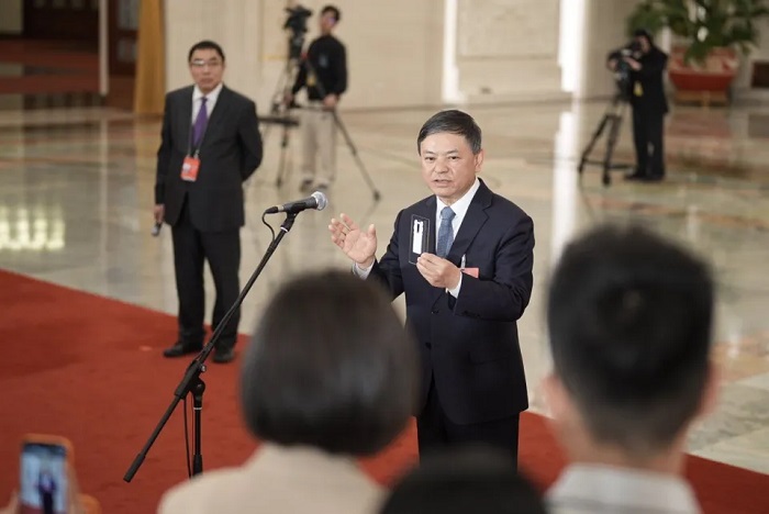 3月12日,北京,人民大會(huì)堂,十四屆全國人大四次會(huì)議第三場“部長通道”集中采訪活動(dòng),生態(tài)環(huán)境部部長黃潤秋接受記者采訪。(中青報(bào)·中青網(wǎng)記者 李雋輝/攝)