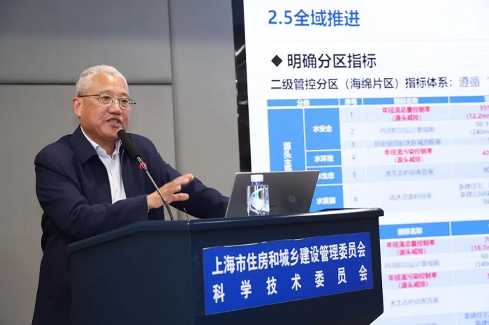 海綿城市建設是城市尺度的系統工程,需要多專業協同。全國工程勘察設計大師、海綿城市建設工程技術創新中心主任張辰在會上首先系統闡述了全域海綿城市建設的技術邏輯、實施路徑與長效機制。在介紹上?!笆奈濉焙>d城市建設取得的顯著成效時,他詳細解讀了2030年新增450平方公里達標區等目標規劃,以及四類管控分區的差異化指標制定,并分享了通過源頭減排、過程控制、系統治理全鏈條推進的多個海綿改造實例,為超大城市海綿城市建設提供了權威技術示范。